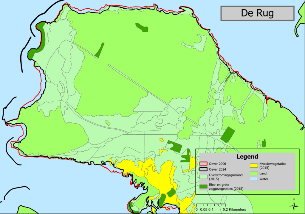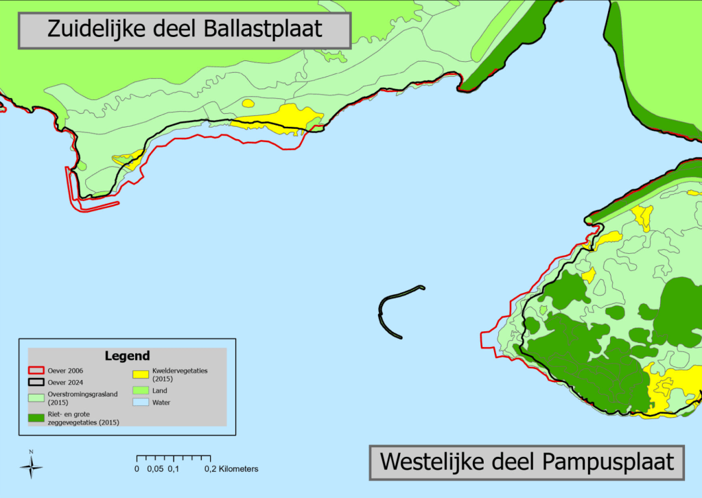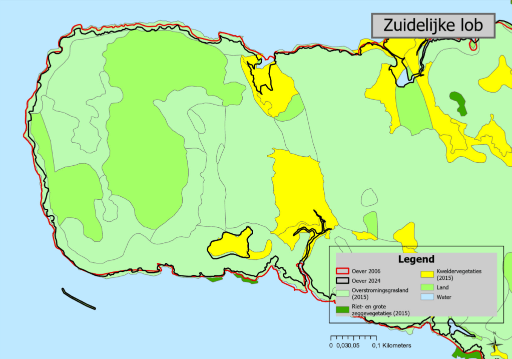 Dan volgt het inhoudelijke gedeelte van dit project. We verdelen de groep op in twee, waarbij de ene helft kijkt naar de ecologische aspecten die komen bij oeverafslag. Denk hierbij aan de impact op vogelsoorten waarvoor het gebied is aangewezen als Natura 2000 gebied (VR), maar zeker ook de bredere ecologische aspecten die veranderen door oeverafslag. De andere helft kijkt naar de oeverafslag zelf; Hoeveel oever is er afgeslagen? Op welke locaties is de oever afgeslagen? Welke vegetatietypen komen voor op deze locaties? De oeverafslag-analyse is uitgevoerd via ArcGIS-pro, waarbij de oever van 2006 en 2024 met elkaar vergeleken zijn. Hierdoor ontstaat er een beeld in welke mate en op welke locaties de oever is afgeslagen. De resultaten zijn hieronder te zien.